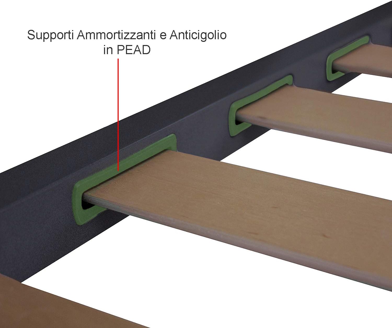 - Ortopedica , telaio ferro ,doghe in faggio. - 4 piedi in ferro con zocolino antiscivolo. - Stabile, equilibrata e forte. - 13 doghe in legno multistrato di faggio. - barre centrali su matrimoniali,